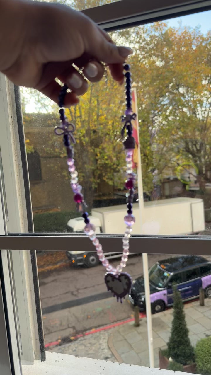 This necklace features a playful, pastel aesthetic with a mix of pink and purple beads in various shapes and finishes. It includes glossy round beads, translucent faceted beads, star-shaped beads, and small flower accents. A few larger decorative beads shaped like cute animals add extra charm. At the center hangs a standout lilac pendant in the shape of a dripping heart, giving the piece a dreamy look. The overall style is youthful, colorful, and Y2K-inspired.