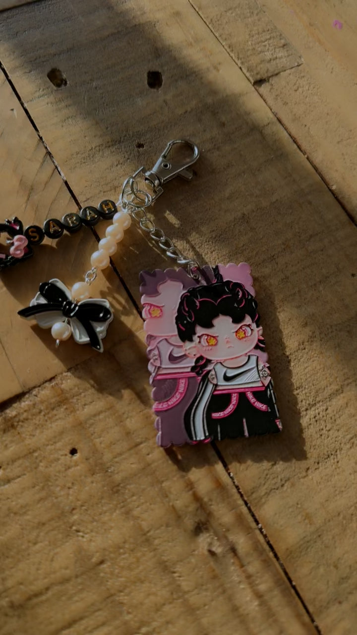 Create a keychain that feels uniquely you with this custom name anime-inspired charm. Featuring a kawaii illustrated character plaque, glossy black-and-white bow charm, and a strand of soft pearls, this accessory adds the perfect mix of edgy and cute to your keys, bag, or lanyard.