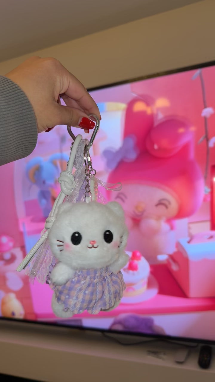 This adorable kawaii keychain features a soft plush kitty dressed in a pastel lavender gingham outfit, paired with layered lace ribbons and cute accessories like a mini racket charm and gingham fish tag. Perfect for decorating bags, phones, backpacks, purses, and more!